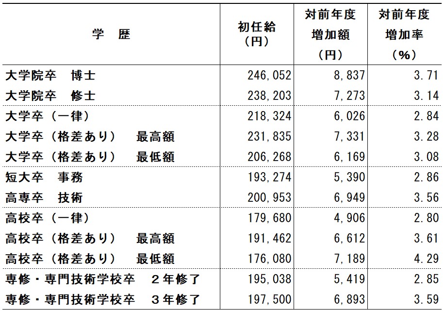 - 2023年度の学歴別の初任給額は下表のとおり。