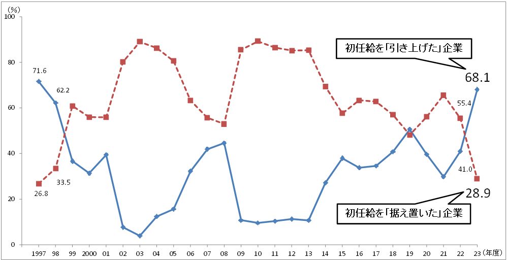 - 2023年4月入社者の初任給を「引き上げた」企業は68.1%(前回2022年度調査41.0%)だった。1998年度以降で最も高く、25年ぶりに6割を超えた。一方、「据え置いた」企業は28.9%(同55.4%)。