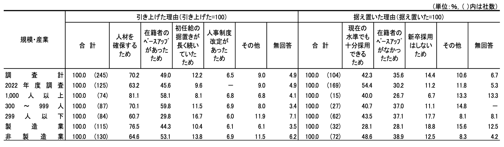 「引き上げた」が「据え置いた」を4年ぶりに上回った。 - 「引き上げた」理由(複数回答)は、「人材を確保するため」が前回比7.0ポイント増の70.2%で最も多かった。