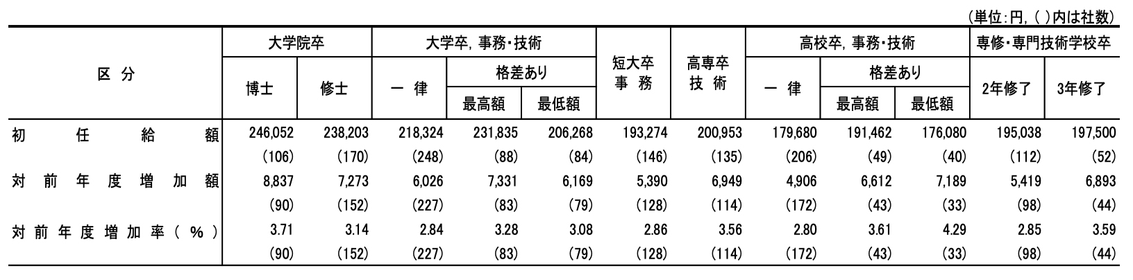 職種やコースなどで初任給額を区分していない場合(一律)、大学卒は21万8,324円(前年度比2.84%、6,026円増)、高校卒は17万9,680円(同2.80%、4,906円増)。職種やコースなどで初任給額を区分している場合(格差あり)、大学卒は最高額の平均は23万1,835円(同3.28%、7,331円増)、最低額の平均は20万6,268円(同3.08%、6,169円増)、高校卒は最高額19万1,462円(同3.61%、6,612円増)、最低額17万6,080円(同4.29%、7,189円増)だった。