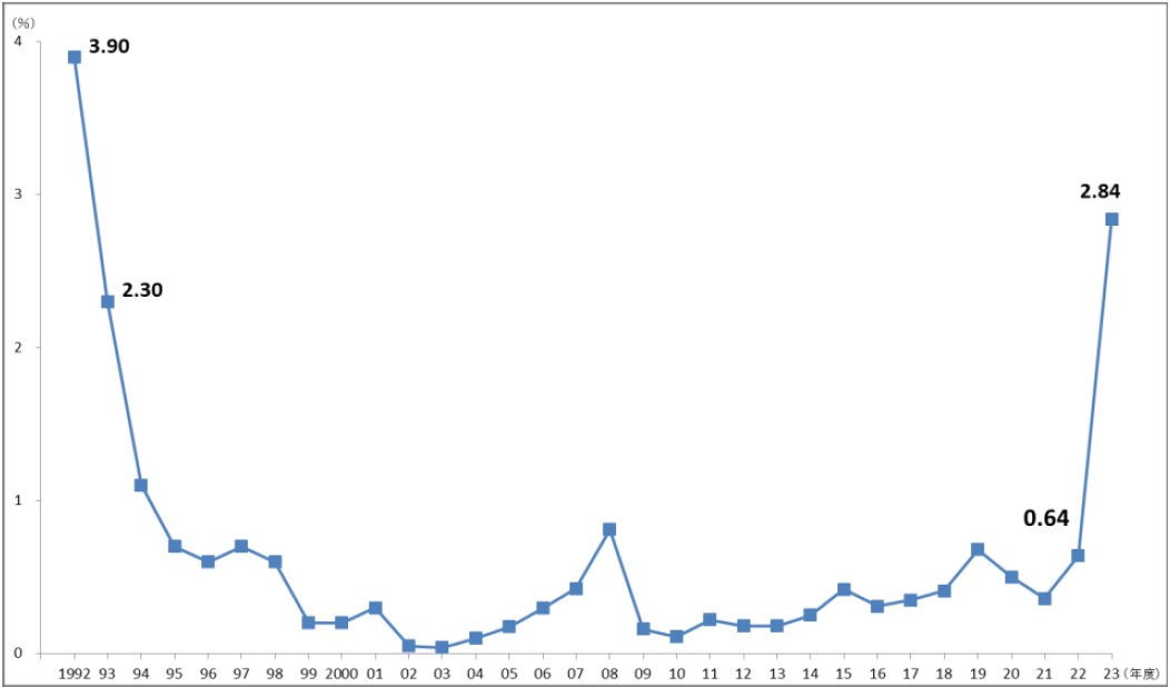 大学卒(一律)における初任給額の対前年度増加率の推移(1992年度以降)
