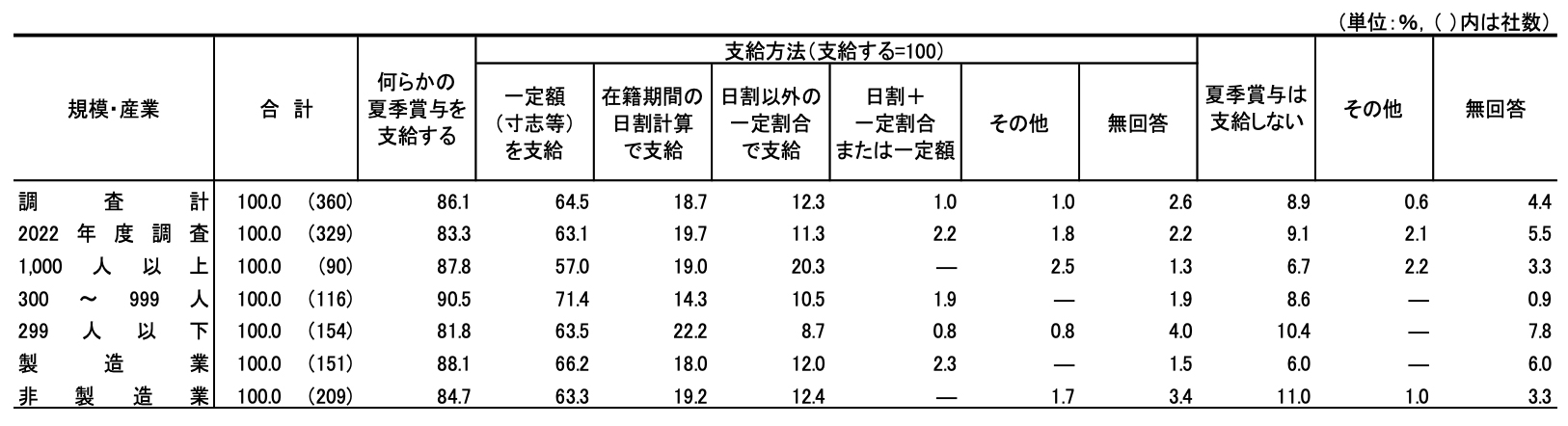 「何らかの夏季賞与を支給する」企業の支給方法をみると、「一定額(寸志等)を支給」が最多で64.5%、次いで「在籍期間の日割計算で支給」18.7%、「日割以外の一定割合で支給」12.3%などとなっている。