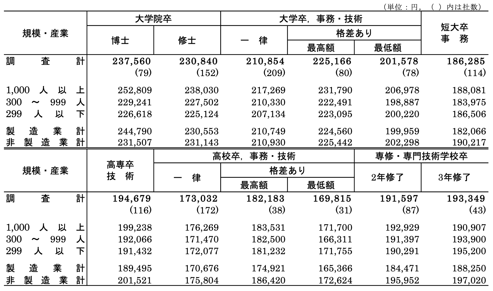 022年度の初任給額をみると、職種やコースによる格差がなく、一律に初任給を決定している企業の場合、大学卒は210,854円、高校卒は173,032円であった。