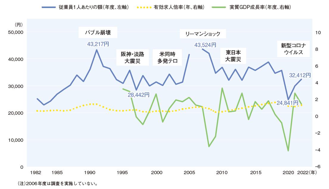 図表 2 従業員1 人あたりの額と有効求人倍率・実質GDP 成長率の推移