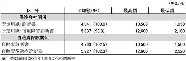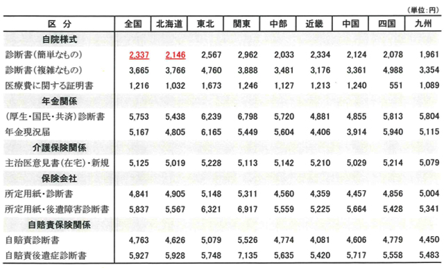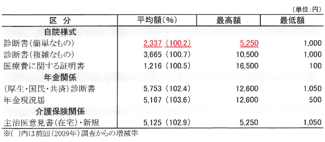 本調査によると、各医療機関が発行する自院様式による「診断書(簡単なもの)」の全国平均額は2,337円であった。前回2009年調査2,332円より0.2%増。