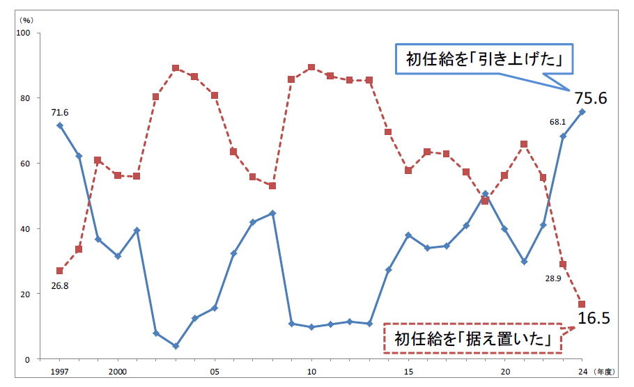 - 2024年4月入社者の初任給を「引き上げた」企業は75.6%(前回2023年度調査68.1%)に上った。同様の問いを設けた1997年度調査以降で最も高く、27年ぶりに7割を超えた。他方、「据え置いた」は16.5%(同28.9%)、「引き下げた」は前回に続きなかった。