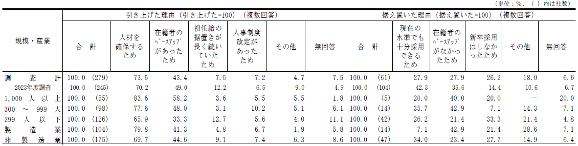 また「据え置いた」理由(同)は、「現在の水準でも十分採用できるため」が14.4ポイント減、「在籍者のベースアップがなかったため」が7.7ポイント減で、ともに27.9%だった。一方、「新卒を採用しなかったため」は11.8ポイント増の26.2%となった。