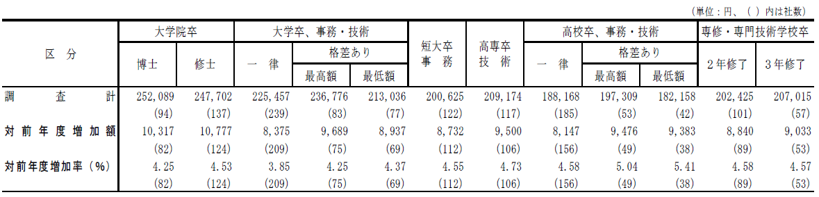 - 大学卒と高校卒は、一律に初任給額を決定している場合と、職種やコース(総合職と一般職、広域勤務と地域限定勤務など)で初任給額に格差を設けている場合の「最高額」と「最低額」を聞いている。