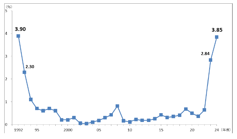 大学卒(一律)における初任給額の対前年度増加率の推移(1992年度以降)
