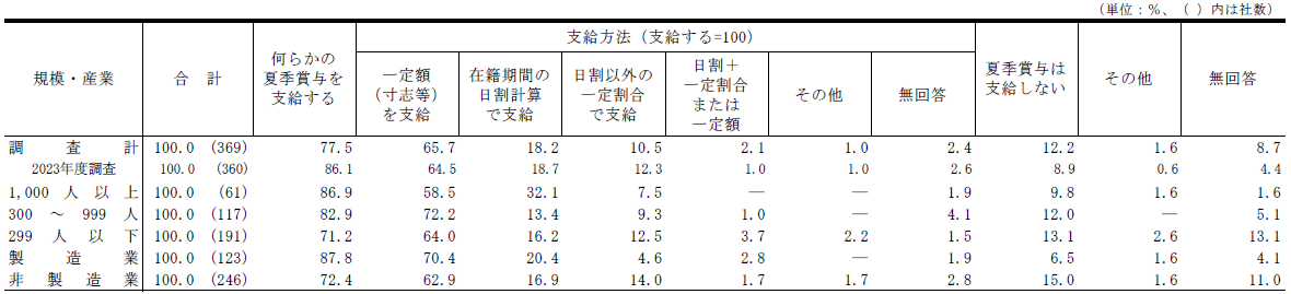 - 新入社員に「何らかの夏季賞与を支給する」企業は77.5%、「支給しない」は12.2%だった。支給方法は「一定額(寸志等)を支給」が65.7%で最も多かった。