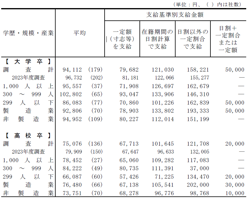 2024年度決定初任給は、1992年度以来32年ぶりに全学歴で前年度から3%超の増額となった。主な学歴別初任給額の水準は、職種やコースなどで初任給額を区分していない場合(一律)、大学卒が22万5,457円(前年度比3.85%増)、高校卒が18万8,168円(同4.58%増)となった。規模別にみると、大学卒は「1,000人以上」24万1,082円(同5.50%増)、「300~999人」22万9,423円(同4.13%増)、「299人以下」21万8,118円(同3.13%増)、高校卒は「1,000人以上」19万2,686円(同5.67%増)、「300~999人」19万2,392円(同4.69%増)、「299人以下」18万3,698円(同4.03%増)となっている。