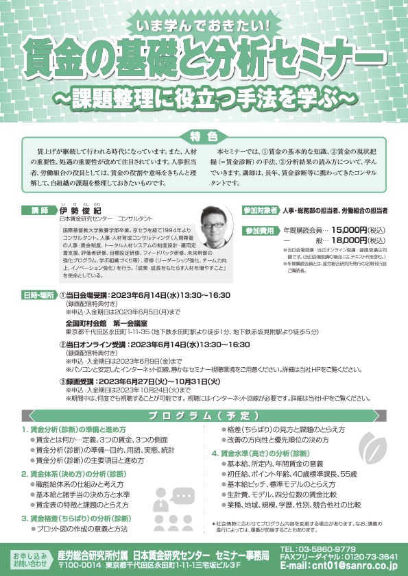 本セミナーでは、①賃金の基本的な知識、②賃金の現状把握(=賃金診断)の手法、③分析結果の読み方について、学んでいきます。講師は、長年、賃金診断等に携わってきたコンサルタントです。
